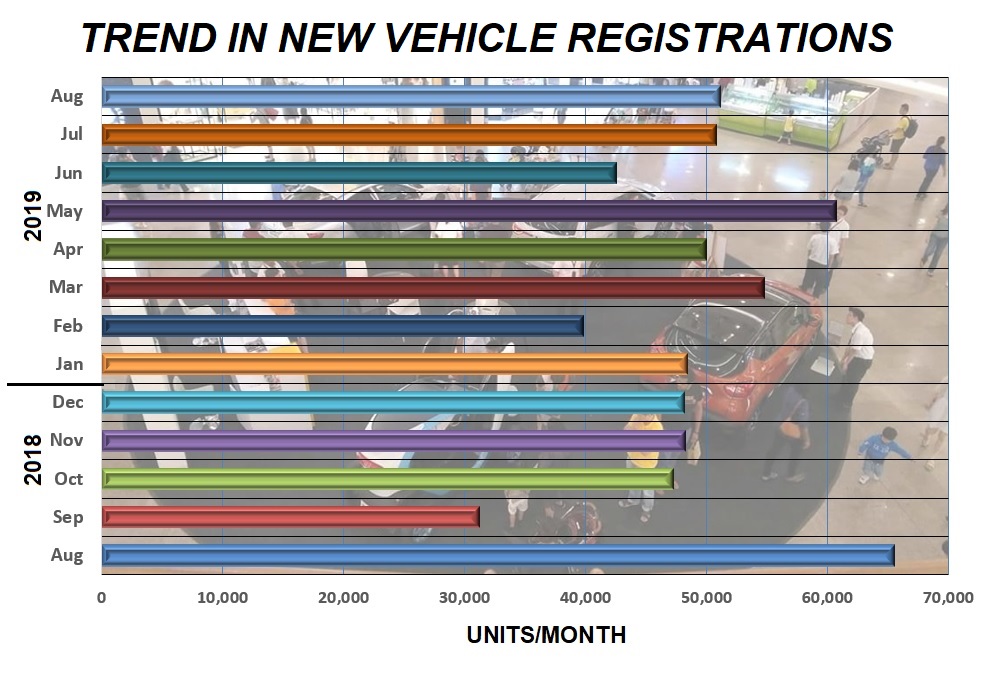 ♦ The same month in 2018 saw a significantly higher TIV due to the surge in sales as a result of no GST being charged. 65,550 vehicles were registered in August 2018, 22% higher than the TIV for August in 2019.
