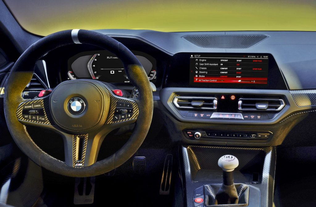 Mot unexpectedly, the interior of the 3.0 CSL has extensive use of carbonfibre and other lightweight construction measures which emphasize the puristic sportscar characteristics. Instead of additional seats, the rear has two integrated helmet compartments. CFRP trim in the door panels and reduced acoustic insulation also contribute to the extremely sporty flair.
