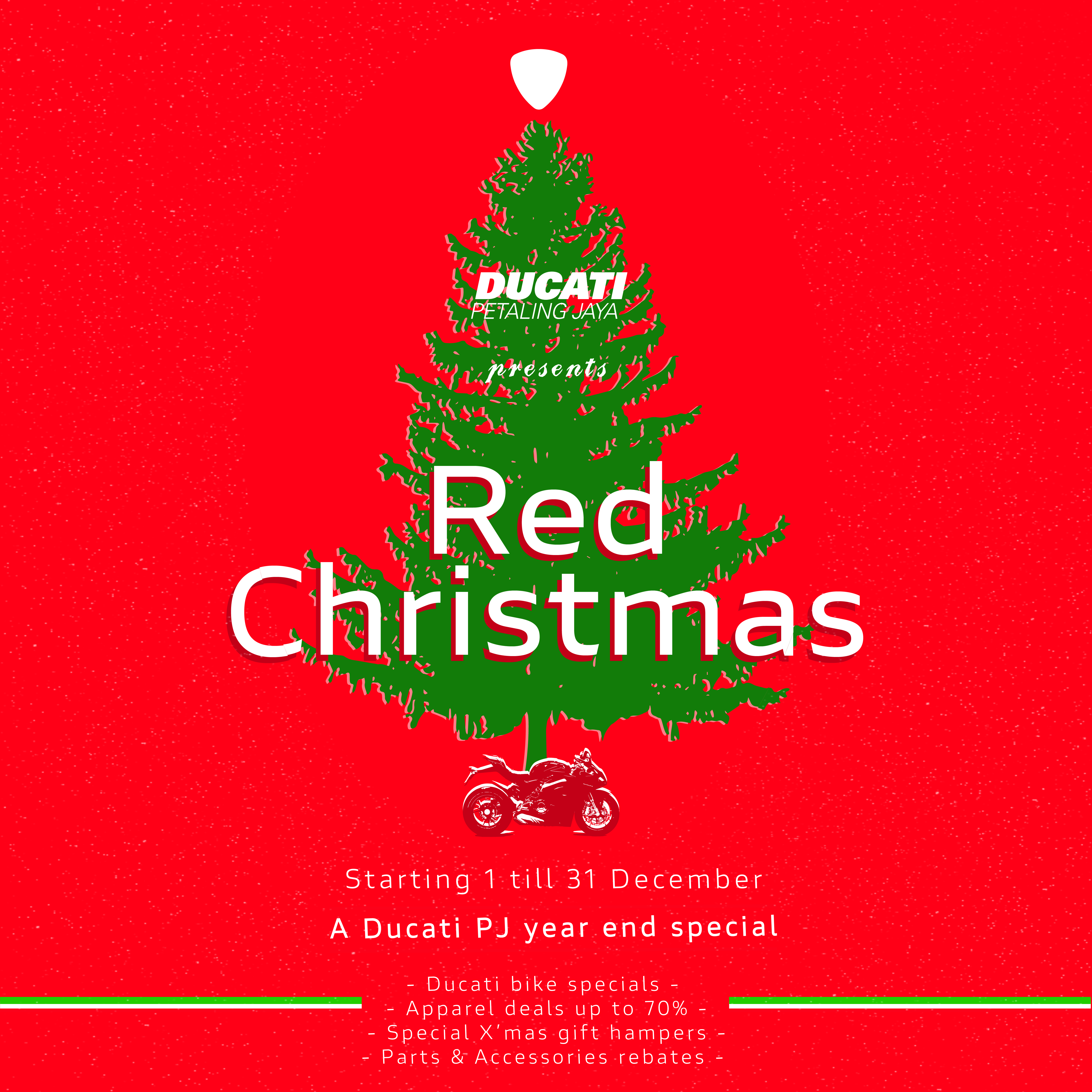Customers will also be treated to a 25% rebate for Desmo service parts as part of its pre-purchase program. To sweeten the deal, customers with minimum spend of RM600 in a single receipt will bring home a complimentary authentic Ducati T-shirt worth RM250! As a token of appreciation for the continuous support from Ducati fans and owners, Ducati Malaysia will also be providing a free 15-point check at the Ducati Service Clinic Ducati Malaysia, Next Bike Sdn Bhd, Lot 1, Jalan 51A/221, 46100 Petaling Jaya,Selangor, from 21st – 23rd December. This special value added service is available from 10am to 5pm and is open to all Ducati models, including official imports and grey import bikes.