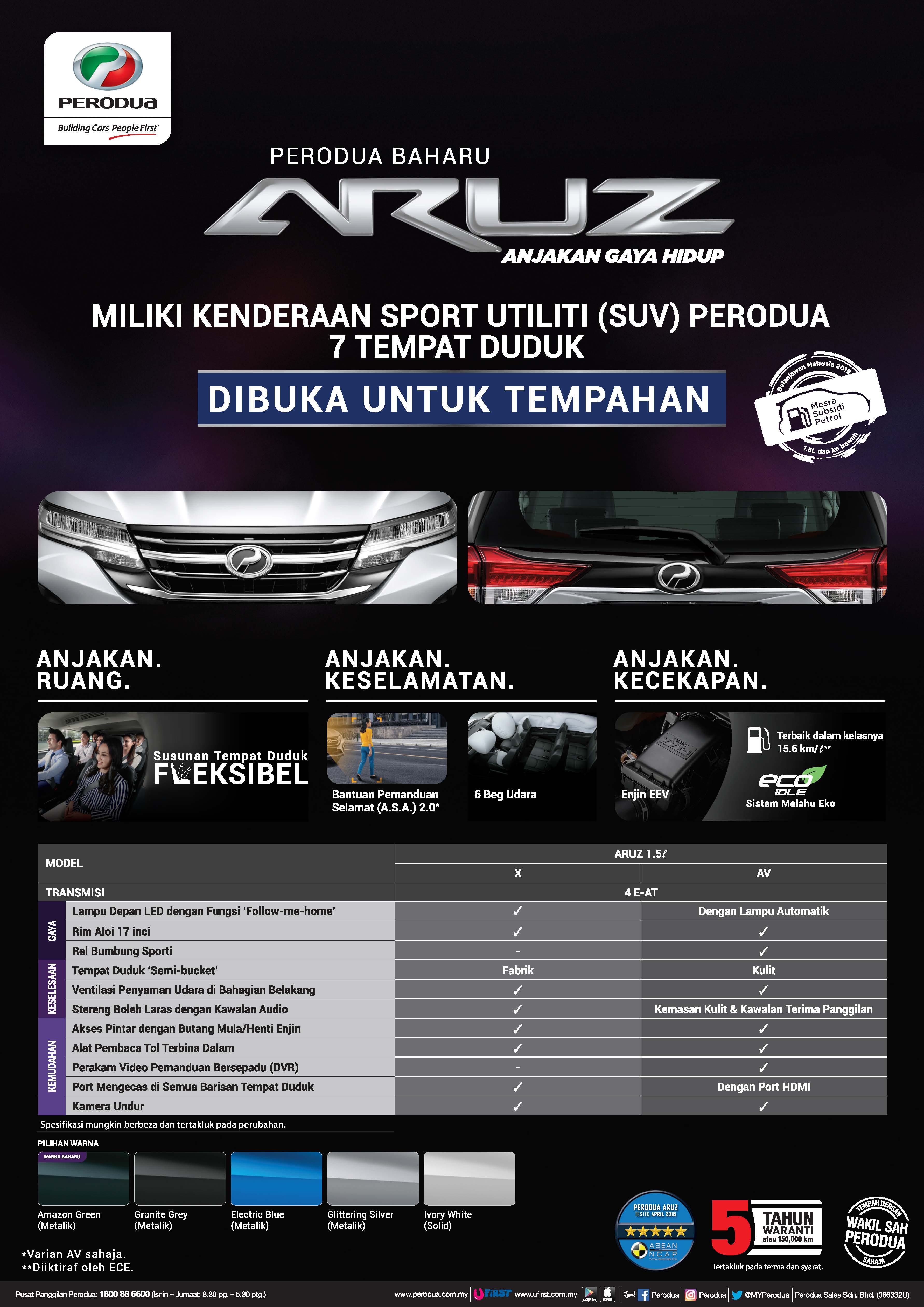 “The Perodua Aruz is expected to complement our existing product line-up and based on our value proposition, we expect sales of this new model to average 2,500 units monthly or 31,200 units by end-2019,” Dato’ Zainal added. Two variants of the Perodua Aruz are offered, namely the 1.5 X and 1.5 Advance, with five colours available – Ivory White, Glittering Silver, Electric Blue, Granite Grey and a new Amazon Green.