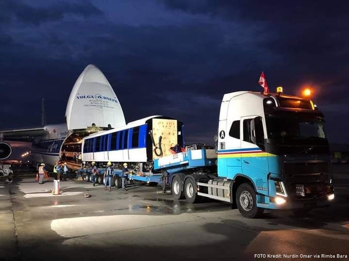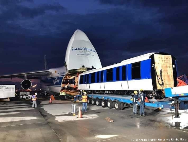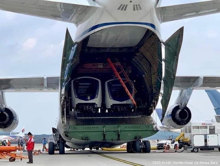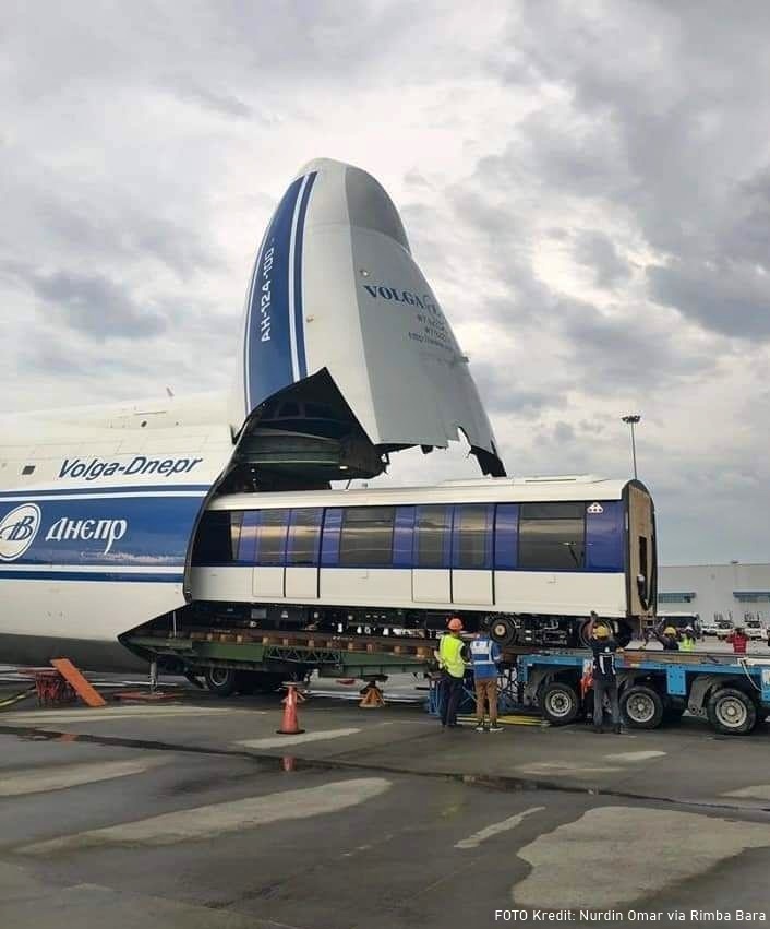 Delivering a completely built-up train would normally be done by ship, a journey that takes time. To get its trains to Malaysia faster, Prasarana Malaysia Berhad, the public transport company, decided to use an Antonov An-124-100 operated by Russian airline company, Volga-Dnepr.