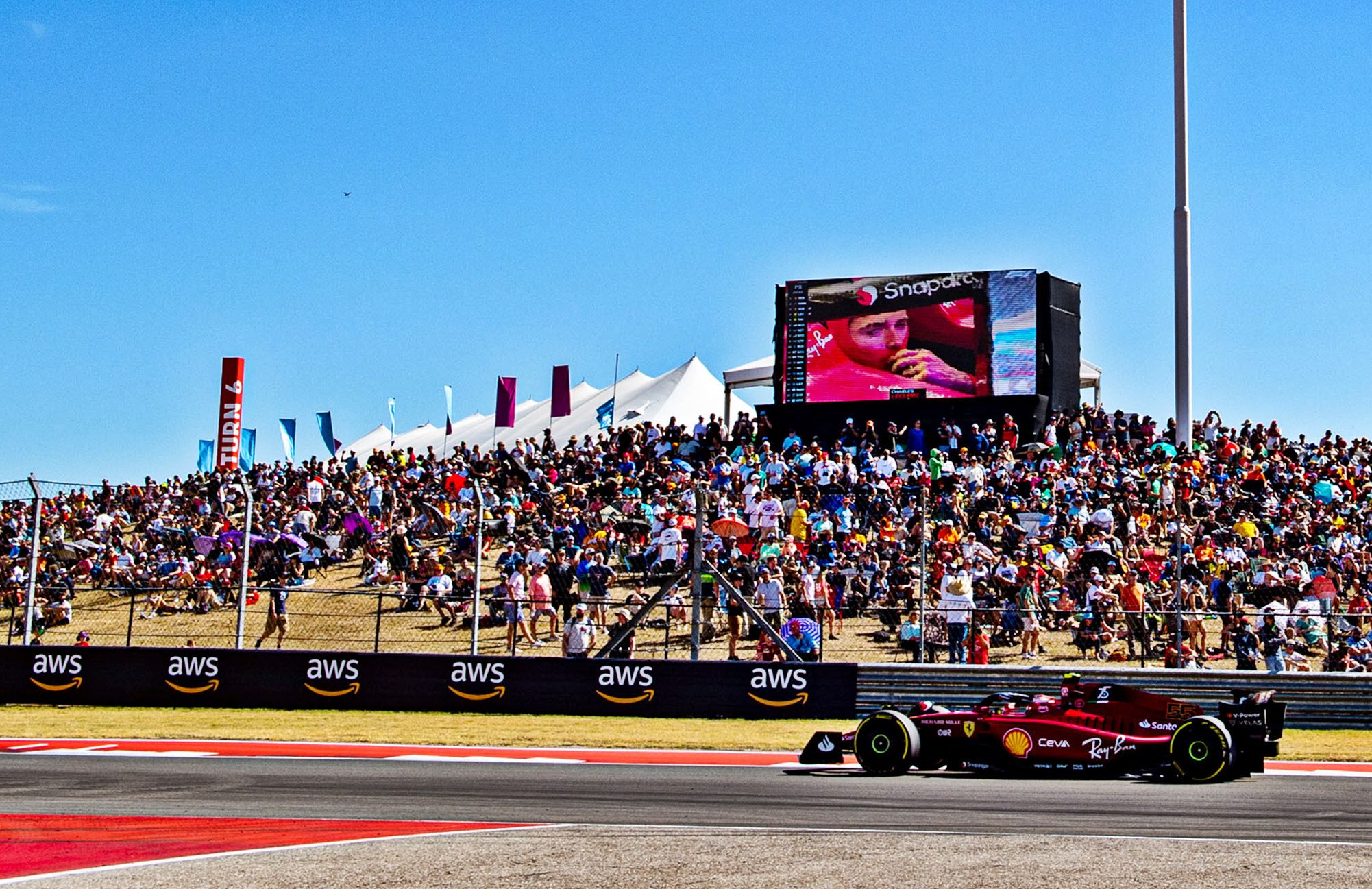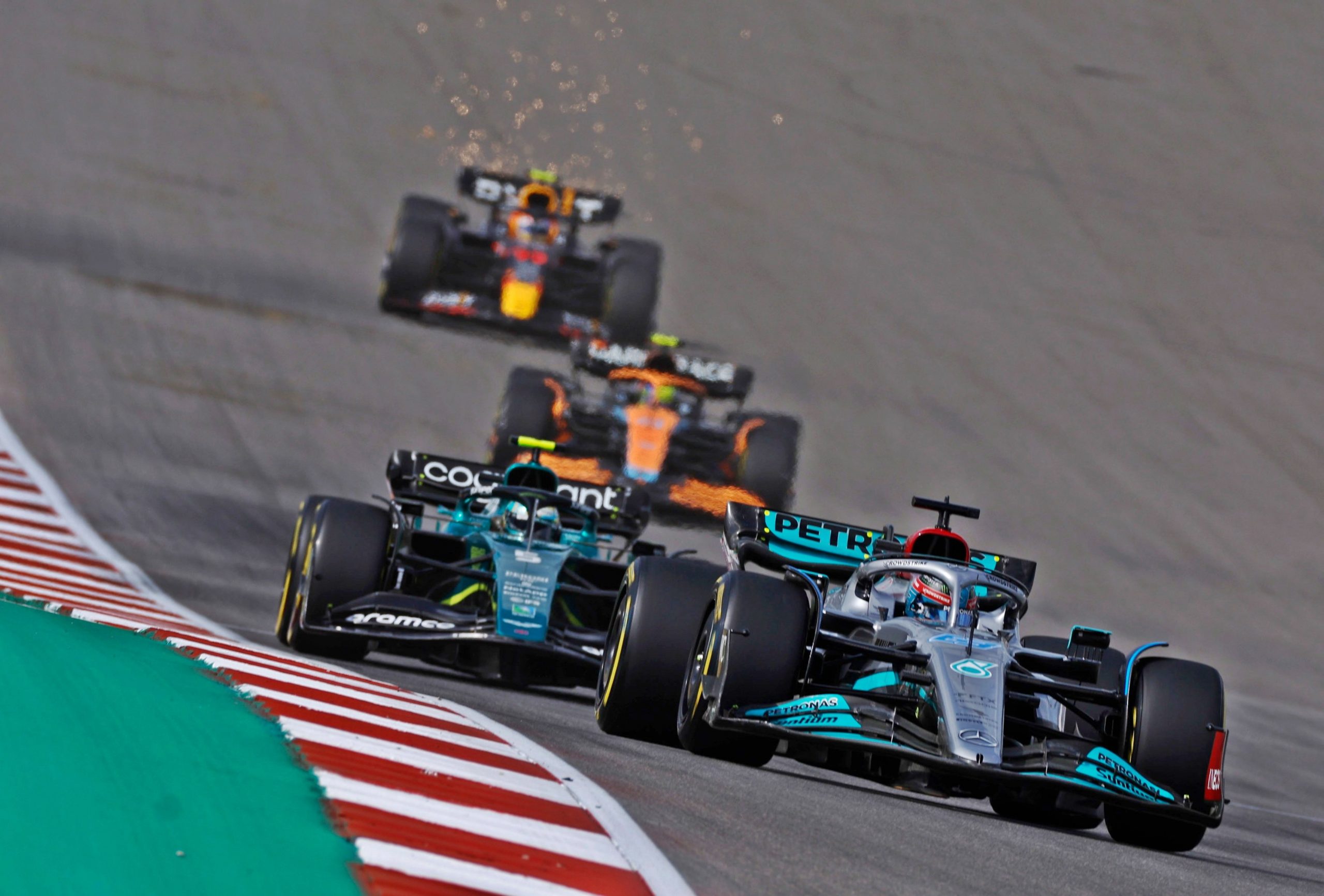 As the lights went out to start the US Grand Prix, Ferrari’s Carlos Sainz got off cleanly from his pole position but Red Bull’s Max Verstappen next to him had just as strong a take-off and was the first to reach Turn 1. Just behind, the two Mercedes-AMG cars were also closing in on the corner and George Russell locked up, coming in contact with Sainz who went into a spin.