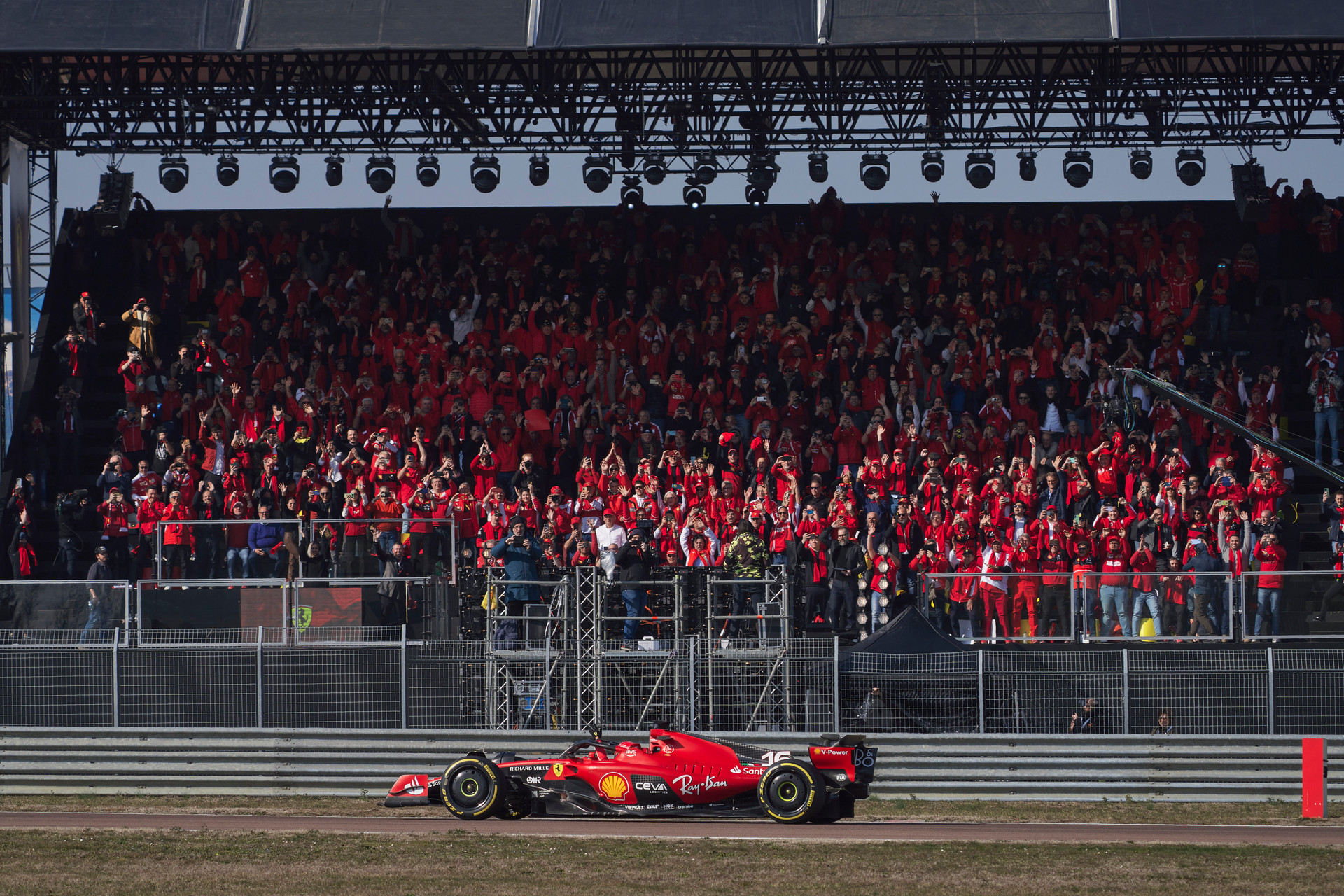 Before the launch, Charles Leclerc and Carlos Sainz went to greet the crowd which included many members of the various Scuderia Ferrari Clubs and students from Muner, the Motorvehicle University of Emilia-Romagna, and some from the Alfredo Ferrari Higher Education Institute, along with their teachers.