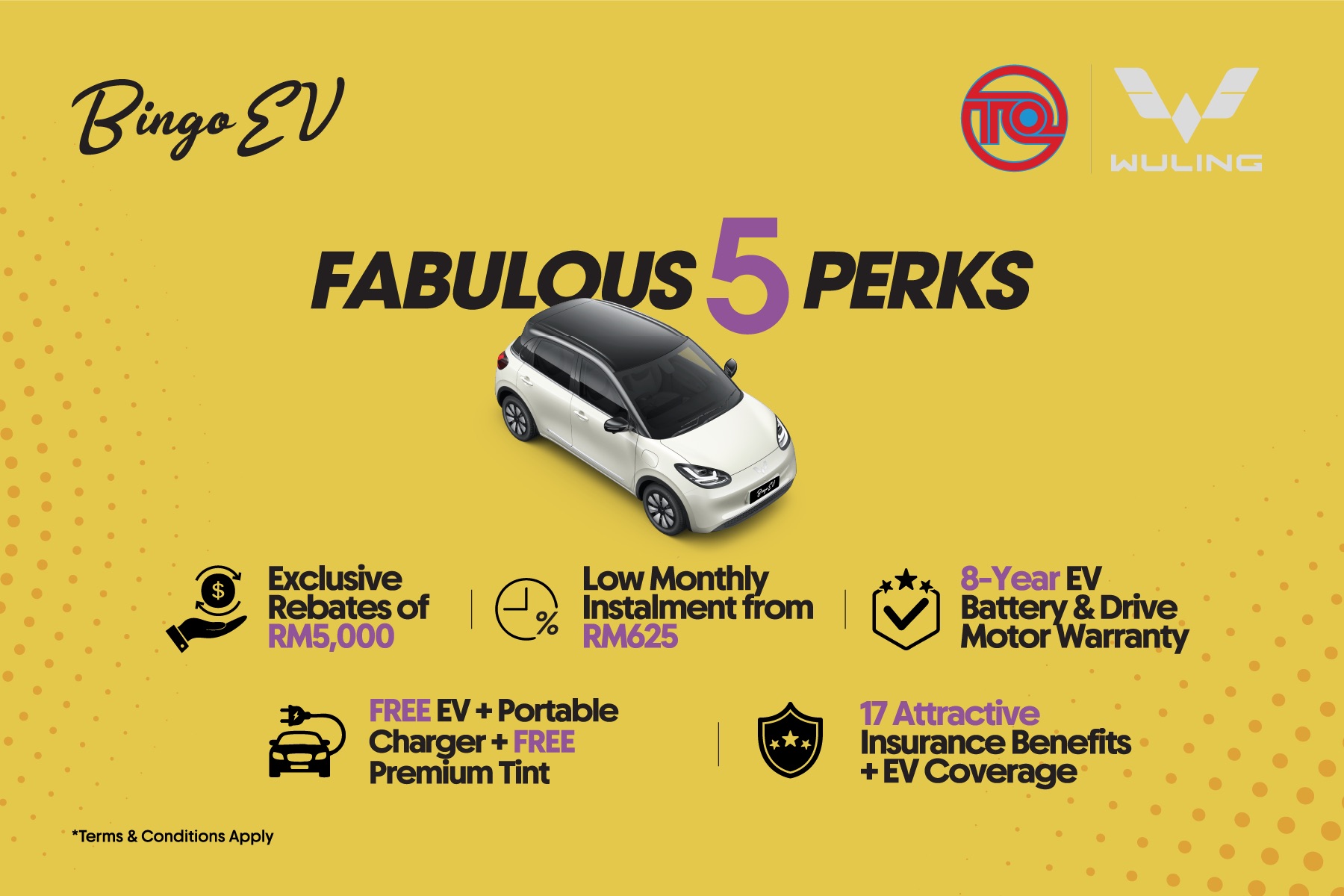 Pelanggan yang telah membuat tempahan dan akan menempah TQ WULING Bingo EV layak menikmati “Bingo’s Fabulous 5 Perks” yang bernilai lebih daripada RM12,000, termasuk: