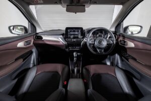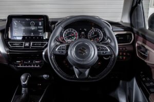 Inside, Suzuki has taken a straightforward yet contemporary approach. A 9-inch HD touchscreen anchors the dashboard, offering Apple CarPlay, Android Auto, a 360-degree camera and a Head-Up Display—an uncommon feature in this segment. A leather-wrapped steering wheel with tilt and telescopic adjustment, cruise control and wireless charging completes the driver-focused equipment list.