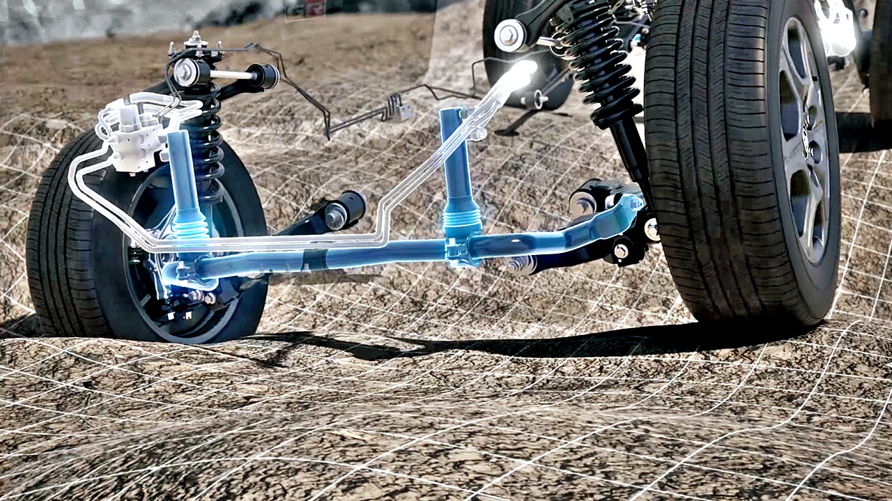 The front suspension is a straightforward MacPherson-type strut with circuit-tuned coil springs, shock absorbers and stabilizer bars, For the rear suspension, there is a double-wishbone type multilink system that accommodates the AWD system’s goal of maximum agility and stability.